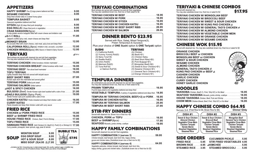 Happy Teriyaki Dupont proudly serves the community with authentic Japanese and Chinese Cuisine.